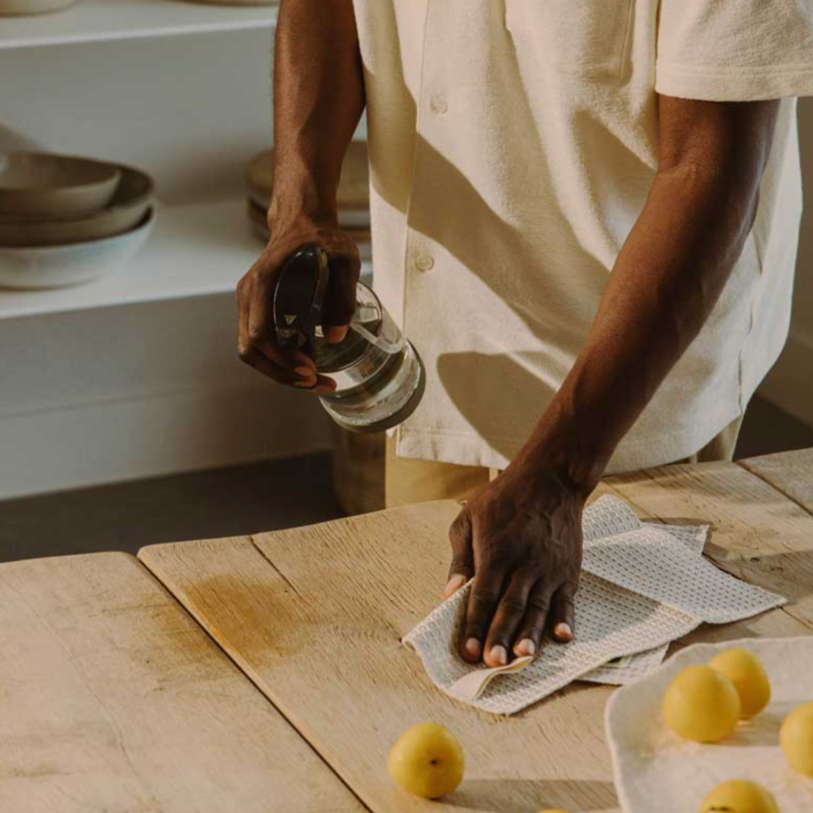 A set of three absorbent, fast-drying, and lint-free cleaning cloths, woven in a loose waffle pique. Made from GOTS and IVN Best certified linen.