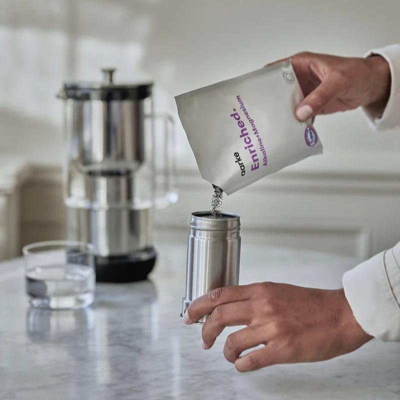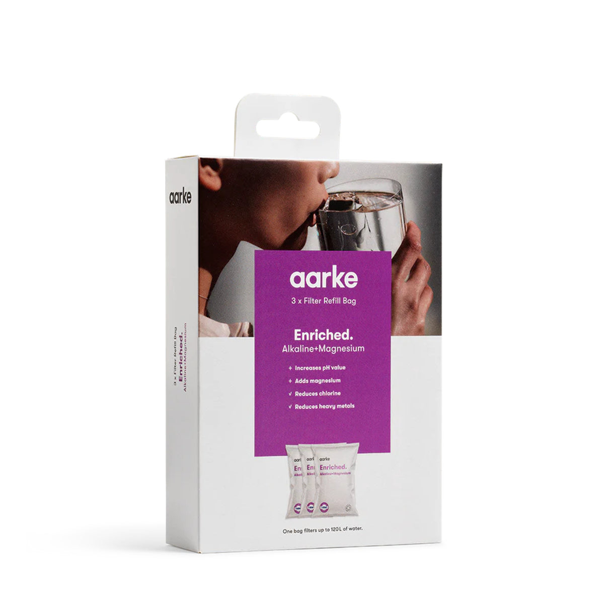 Made exclusively for the Aarke Purifier technology, the granules in the bag are poured into the Purifier’s refillable water filter cartridge. The granules are sold in a 3-pack of refill bags equivalent to 3 filter cartridge refills. One bag filters up to 120 liters of water and lasts up to 4 weeks. Made in collaboration with BWT, one of the world’s leading water technology companies.
